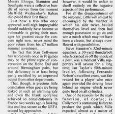 Villa enjoyed a purple patch in which they might have gone ahead, with Collymore standing on the ball when picked out by Alan Wright's low cross and then Clarke saving a low drive-on-the-turn by Yorke.