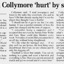 Stan Collymore makes his 10th appearance in a Villa shirt after his record signing to make it W3 D2 L5, 1 Goals, 2 Assists and 1 Booking so far in his Villa career.
