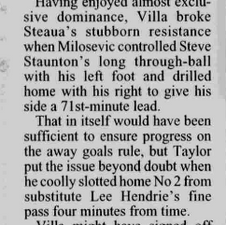 Collymore could have had a hat-trick, while Taylor and Staunton also missed some very good chances before Miloลกeviฤ pounced in the 71st minute. He latched onto a long ball from Staunton and broke clear of Csik, before rifling a low shot past Ritli. Then five minutes from time Hendrie released Taylor who beat the offside trap and kept his cool to plant a shot wide of the exposed Steaua 'keeper.