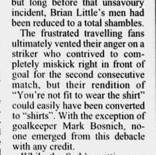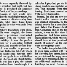 A terrible day for everyone associated with Villa, but even the result is overshadowed by Savo Miloลกeviฤโs behaviour on the Ewood Park pitch. Hopelessly frustrated, Miloลกeviฤ let his emotions take control and spat to the ground in front of the Villa fans. An inexcusable action made all the more bizarre by the fact that Villaโs faithful had taken Miloลกeviฤ to their heart throughout his time with the club providing him with unwavering support. Miloลกeviฤโs Villa career inevitably dwindled after this game but it is to the credit of all parties that he could take the field again in a Villa shirt, albeit less regularly, before leaving at the end of the season. Something that but for his stupid behaviour this winter afternoon didnโt need to happen.