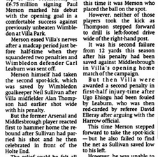 Paul Merson, 30, makes a goalscoring debut after joining from Middlesbrough for a fee of ยฃ5,400,000 earlier this month to become the 727th player to play for Villa in first team League or Cup football.