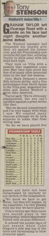 Not surprisingly Graham Taylor, Watfordโs manager then and now, stuck with the team who had seen off Bradford on Saturday. He may have seen last night as a chance to thank the Villa fans for their support during his spell there, but he knew points were too precious to dole out favours as well.