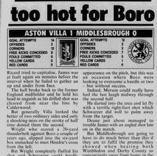 They created some chances of their own, with Ince the primary creative force. Twice his centres caused problems for David James in the Villa goal, with Brian Deane unfortunate not to score from the first.