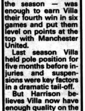 Villaโs gates are around 10,000 down on last seasonโs early figures. This can be attributed to a seen-it-all-before scepticism, given their teamโs dramatic new-year collapse and the Birmingham publicโs traditional August exit to the coast. Whatever the reasons, the lower gate receipts make worrying reading for Doug Ellis and John Gregory when calculating the transfer kitty.
