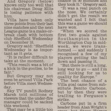 In fact Gregory was merely winding up the post-match press conference, although seasoned Villa watchers thought they sensed a chill in the atmosphere which had nothing to do with the coldness of the afternoon. Gregory, after all, had recently received a vote of confidence from his chairman, which from Doug Ellis is like getting the black spot from Blind Pew.