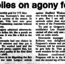 He may be the forgotten man of Newcastle, but Duncan Ferguson succeeded in jogging a few memories here after emerging as a second-half substitute to claim his first Premiership goal in 372 days and increase the odds of John Gregory imminently joining the nationโs unemployed. The strike extended Villaโs torrid sequence of League matches without a victory to nine, leaving them six from bottom with the vultures gathering.