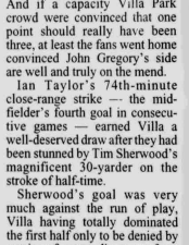 Ian Taylor contributes his 40th goal involvement on his 202nd appearance in a Villa shirt (189 Starts) to make it W92 D47 L63, 28 Goals, 12 Assists and 41 Bookings at a goal involvement rate of one for every 5.05 games played so far in his Villa career.