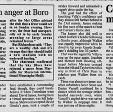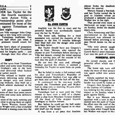 In the 17th minute Villaโs enterprise ought to have put them ahead. An incisive move involving Steve Watson and Merson brought Joachim surging into the area where Walker was required to parry. Taylor was on hand to force the ball home had Stephen Carr not intervened.