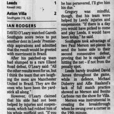 Indeed, it took a staggering double-save from Nigel Martyn to prevent the scoreline embarrassing Leeds further. He kept out Mersonโs header from Steve Watsonโs cross with an acrobatic one-handed leap, before somehow deflecting a follow-up strike from George Boateng over his bar.