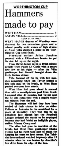 "Aston Villaโs reprieve, after they had lost the original tie on penalties, had heralded a resurgence of form by John Gregoryโs side and they returned to Upton Park following a run of four wins in five games. Nevertheless their attack was restricted by the absence of the injured Dion Dublin and the ineligible Benito Carbone."