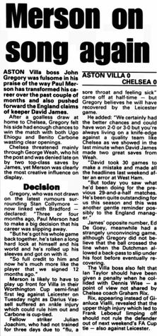 The reborn Merson may now have to become Renaissance Man since Villaโs shortage of strikers points to an out-and-out attacking role in the Worthington semi-final first leg against Leicester tomorrow night. Here he produced virtually all Villaโs opportunities with crosses and free-kicks, quite apart from his sideโs most enterprising moment when he chipped Emerson Thome with one foot and then volleyed just over with the other.