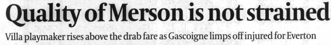 For all Mersonโs selfless running between Villaโs midfield and forward line, for all Thomas Gravesenโs endeavour, for all Paul Gascoigneโs delicate promptings, there was little to fuel the belief that here was a game that would entertain the faithful.