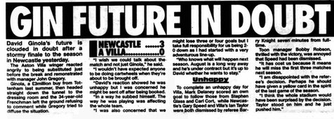 Two minutes later, Gregory lost patience and replaced Ginola, who exchanged angry words with the manager and headed down the tunnel, surely never to appear in a Villa shirt again.