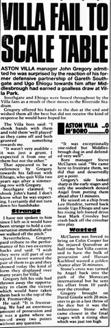 Villa are held by Boro to make it just two defeats in twelve Premier League games under John Gregory but winless in the last two as Gareth Southgate once again demonstrates his lack of class.