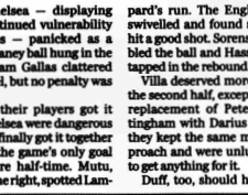 Mutu had an acrobatic overhead kick blocked by Villaโs emergency centre-back Dion Dublin before the Romanian missed an easier opportunity from Frank Lampardโs pass.