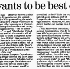 Villaโs completely unpredicted challenge for a Champions League place falters but David OโLearyโs side sit in a remarkably strong UEFA Cup qualifying 5th place with one game to play.
