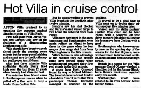"Villa made a very bright start to the match, Darius Vassellโs pace forcing Claus Lundekvam into a hurried backward pass, only for