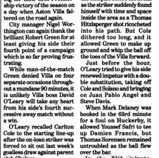 Ten minutes after the restart, Villa manager David OโLeary rejigged his formation introducing Juan Pablo Angel and Stephen Davis, who was making his Villa debut.