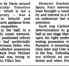 After Spursโ promising start Villa gradually took control and a Noureddine Naybet slip let in Carlton Cole, but his well-struck low drive was kept out by the right hand of Robinson.