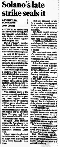 โNolberto Solanoโs late strike gave faltering Aston Villa a much-needed victory over Blackburn at Villa Park.