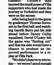 Gareth Barryโs 20-yard drive gave Villa the lead a minute after the break, but Danny Cullip levelled after 57 minutes.