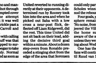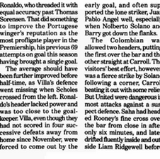 The game settled down thereafter with Villaโs midfield getting to grips with Roy Keane and Scholes, though Liam Ridgewell was cautioned for a flare-up with Ronaldo near the Villa byline.