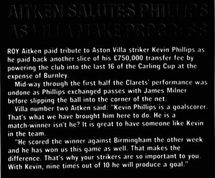 *Aston Villa assistant manager Roy Aitken on Kevin Phillips:*