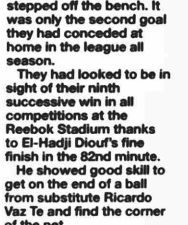 Given that they had conceded only once in the Premiership at the Reebok this season, losing 1-0 at home to Everton in August, there seemed no reason to suppose that Villa, for whom Milan Baros had been singularly ineffective, would equalise. However, Juan Pablo Angel and Luke Moore, both late substitutes, combined two minutes from time to silence starkly the home fansโ merriment.