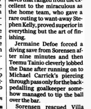 Tainioโs finishing, on the other hand, carried a greater element of surprise, such as when he caught the Villa goalkeeper off his line on the half-hour, forcing Sorensen to make an arch-backed save, or the moment late on when the Finnโs lunging shot was thwarted by the Daneโs quick reflexes. OโLeary did not set out purely to defend. He had Lee Hendrie and James Milner to give Aston Villa width with Gavin McCann and Steve Davis seeking to support the strikers, Milan Baros and Juan Pablo Angel. Early in the match, with Baros coming deep to gain possession before trying to link up with Angel, Villaโs attack had possibilities.