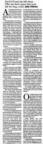 Did Villa fans expect too much? Were they โsugarbagsโ after all? No, they just werenโt fooled by the man in the dugout and no-one else would be as OโLeary permanently disappeared from the management scene.