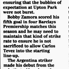 A cheer almost as loud as that which greeted Zamoraโs goal heralded the Hammers debut of Tevez, who joined the fray as a 61st-minute substitute for Harewood.