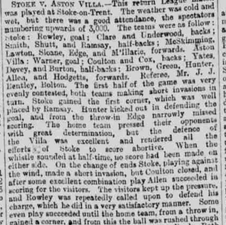 The home team pressed their opponents with great determination, but the defence of the Villa was excellent and rendered all the efforts of Stoke to score abortive. When the whistle sounded at half-time, no score had been made on either side.