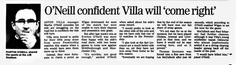 Villa are held to a goalless draw at Wigan but extend their run under Martin O'Neill to just one defeat in thirteen Premier League games drawing 7 and winning 5 five as O'Neill takes David O'Learyโs 2005-06 squad, plus Stiliyan Petrov and transforms a squad that had lost 8 of their last 13 games under OโLeary.