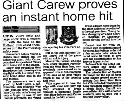 John Carew scores his first goal in a Villa shirt on his second appearance to make it W1 D0 L1 and 1 Goal so far in his Villa career.