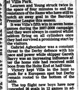 Four minutes later the game was all but over when Derby gave the ball to Gabriel Agbonlahor and, although Bywater saved his shot, Reo-Coker had the presence of mind to loop the ball back across goal to allow Young to slot home.