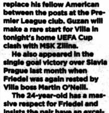 Brad Friedel plays his 167th consecutive Premier League game - a new record - on his 15th appearance in a Villa shirt (10 League Games) during which time he has W11 D3 L1, 17 Goals Conceded at a rate of 1.13 goals per game and 3 Clean Sheets.