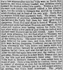 North End pressed for a time, and a grand shot by Robertson looked dangerous, but Coulton cleared, Again North End came near scoring, Warner holding the ball against the post. Hodgetts was next conspicuous for the Villa by a grand run, but Howarth baffled him until Holmes rushed up and cleared. Again the Villa got off at full swing, but Russell pulled them up summarily, and Edwards made a great mistake when on the goal-line in passing back to Ross instead of centring.
