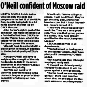 Aston Villaโs Uefa Cup last 32 tie with CSKA Moscow is delicately poised after the first leg at Villa Park on Wednesday night ended in a 1-1 stalemate.