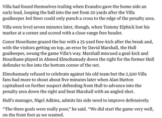 After Conor Hourihane had clipped the top of the bar with a free-kick, former Tigers winger Ahmed Elmohamady pounced on a poor clearance by Hull goalkeeper David Marshall to edge Villa ahead.