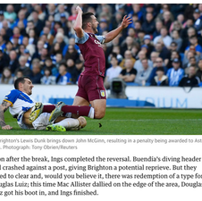 But Ings levelled from the penalty spot in the 20th minute after Lewis Dunk fouled John McGinn in the box.