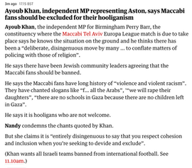 Nandy claims, without providing evidence, that it was the local community around Aston and Witton and Aston Villaโs matchgoing fans who were the problem with the ban being due in โno small partโ to the โrisk posed โฆ to those fansโฆ who support Maccabiโฆ because they are Israeli and โฆ Jewish.โ