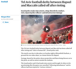 Maccabi Tel Aviv fans riot at their home ground, causing the game against Hapoel Tel Aviv to be abandoned.