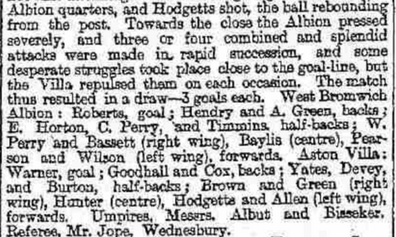The Villa again got the ball in the Albion quarters and Hodgetts shot, the ball rebounding from the post. Towards the close the Albion pressed severely, and three or four combined and splendid attacks were made in rapid succession, and some desperate struggles took place close to the goal-line, but the Villa repulsed them on each occasion. The match thus resulted in a draw - 3 goals each.
