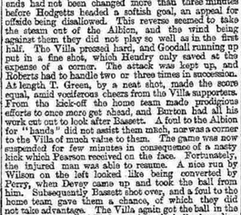 From the kick-off the home team made prodigious efforts to once more get ahead, and Burton had all his work cut out to look after Bassett. A foul to the Albion for “hands “ did not assist them much, nor was a corner to the Villa of much value to them. The game was now suspended for few minutes in consequence of a nasty kick which Pearson received on the face, Fortunately, the injured man was able to resume.