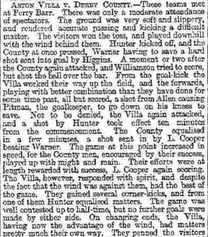 "The possibility of a draw aroused the Villa men, who played with great dash, and put the ball through the County’s goal three times in ten minutes. One point was, however, disallowed on the plea of a previous foul, and the match ended in a victory for the Villa by 5 goals to 3."