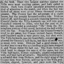 Macmillan kicked away a splendid shot from Dickson, and the right wing of the County then beat Burton, and ran up to the Villa goal. Coulton cleared, however, and once more the Villa attacked.