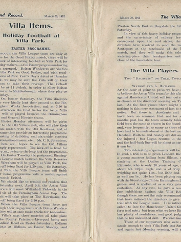 Goalkeeper Len Richards and winger Walter Watson make their Villa debuts aged 19 and 21 after joining from Stourbridge FC and Worksop Town in March 1911 and 1912 respectively.
