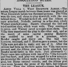 The Villa were now playing a much better game than the Albion, and attacked vigorously, Graham sending in a couple of fine shots, which were, however, well saved by Reader, who turned the second round the bar.